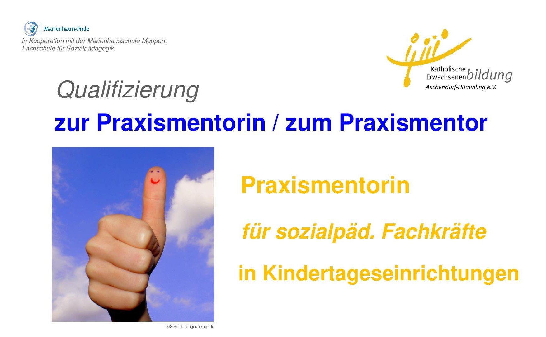 Einen neuen kostenfreien Qualifizierungskurs zum “Praxismentoring für sozialpädagogische Fachkräfte in Kindertageseinrichtungen“ ab dem 21.02.2026 in Meppen und ab dem 12.03.2026 in Sögel bietet die Katholische Erwachsenenbildung in Kooperation mit der Marienhausschule an. Der Qualifizierungskurs vermittelt Inhalte zur fachlichen Anleitung, Unterstützung und Beratung von Auszubildenden in der pädagogischen Arbeit der Kindertagesstätte. Neben der Entwicklung einer praxis- und einrichtungsorientierten Konzeption wird die Einbindung des Praxismentoring ins Team und das Führen zielgerichteter Beratungs- und Reflexionsgespräche thematisiert. Darüber hinaus beinhaltet der Kurs Übungs- und Selbstlernphasen und gibt Hilfestellungen zur Organisation des Praxismentoring in der Einrichtung und zur Entwicklung von Ausbildungskonzepten. Der vom niedersächsischen Kultusministerium geförderte Kurs umfasst 72 Unterrichtsstunden.